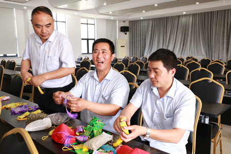 在活動開展前,公司工會精心策劃,提前準備了艾葉、薰衣草、具有驅蚊效果的中藥、針線包以及布料等制作香囊的材料。活動現場熱鬧非凡,公交員工們圍坐在一起,共同觀看了香囊制作步驟圖,隨后大伙兒紛紛拿起香囊材料,擼起袖子,摩拳擦掌,一副躍躍欲試的樣子。手工活比較巧的女同胞們大膽嘗試了難度系數較高的手工縫制香囊,她們拿起步驟圖仔細研究和琢磨,還時不時地交流技巧和心得。“陳姐,這個藏針縫法我們倆看了好幾遍說明,但還是不得要領,您教教我們吧。”“樊師傅,您看我這樣縫對嗎?”許多參與活動的80后、90后公交員工都是第一次制作香囊,她們在老師傅們的親自示范下最終獨立完成了縫制、裝香料、封口配繩、穿珠等工序,當一個個飽滿又精致的三角香囊做好后,她們的內心油然而生一股成就感,紛紛拿起手機拍照,在朋友圈曬出自己的手工成果。男同胞們也不甘示弱,選擇了相對比較簡單的手工灌裝香囊,你拿袋子,我裝香料,大家分工配合,不一會兒就做了許多漂亮又實用的香囊,得到了在場女同胞的夸贊,難得展現了硬漢柔情的一面。